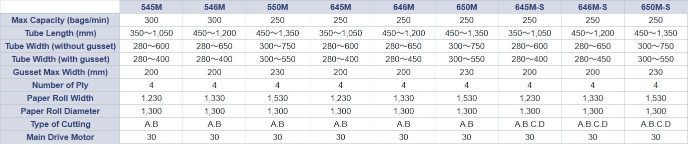 Model 500M/600M series multi-wall tuber is a stepped-cut tuber designed to minimize down time for tube size change and protect noise during operation. Model 600M-S series tuber is a universal type for availability of 4 kinds of cutting methods. Hot melt adhesive extruder for bonding paper lamination and PP/PE Woven is available as an option.
