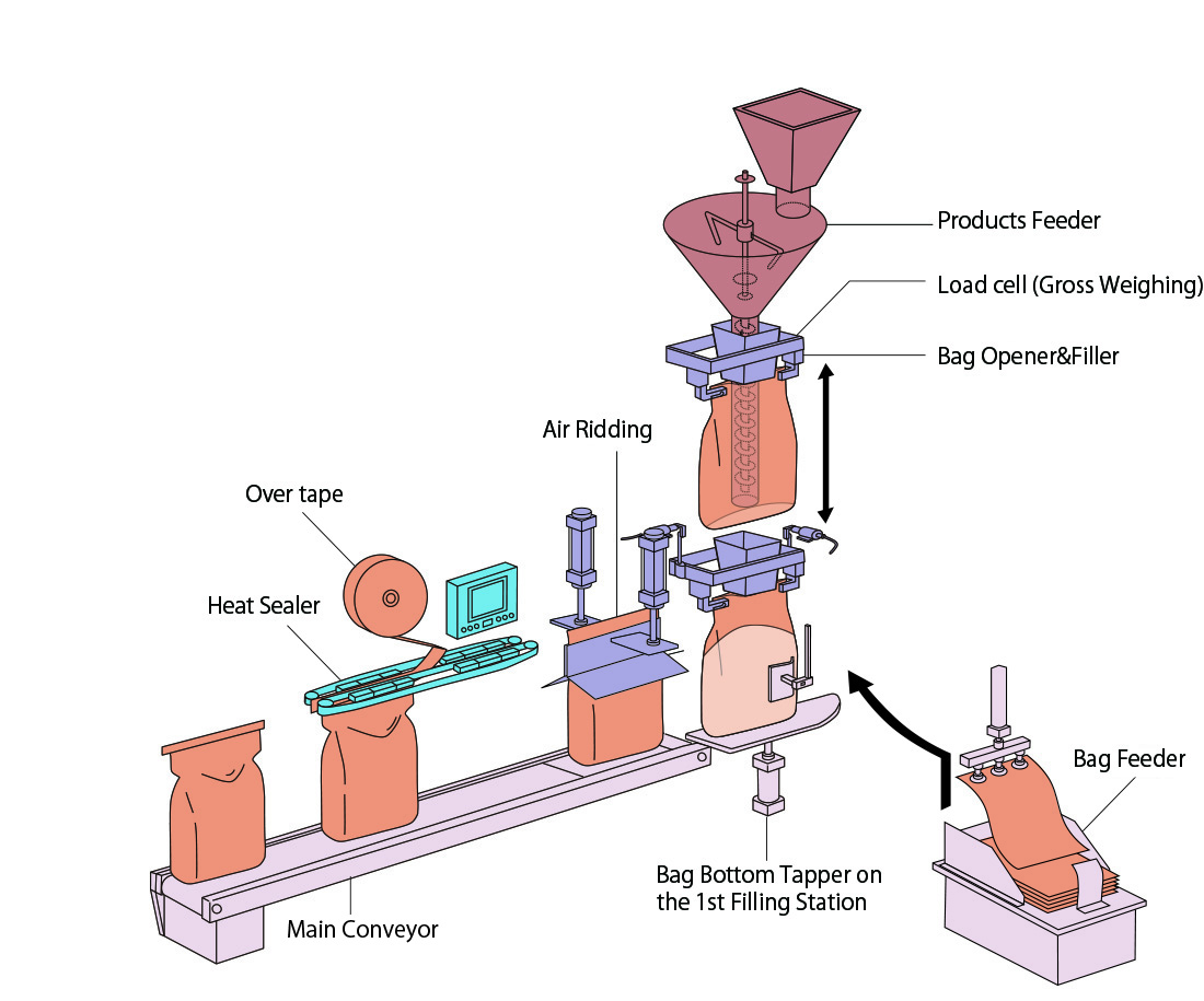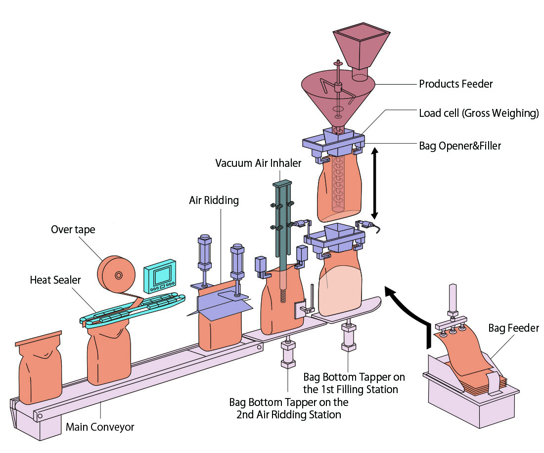 • At the secondary section, either a vacuum air inhaling rod for improved vacuum efficiency; or calibration for enhanced weighing accuracy can be installed.