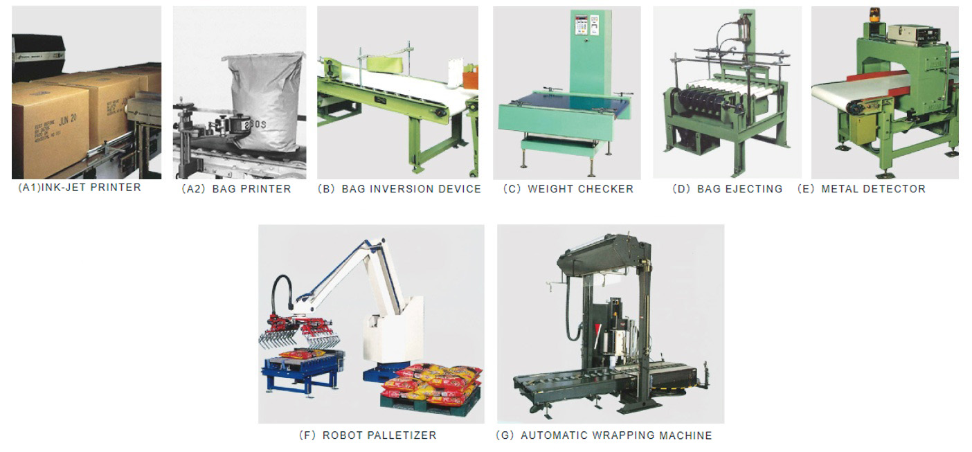The wrapping machine can wrap bags with film palletized on a table. The table rotates and wrapping film roll moves up to the upper limit and down to the lower limit, then wrapping film wraps spirally bags palletized. The one cycle operation can be done automatically. Inverter-motors control table rotation speed and film roll vertical motion speed.