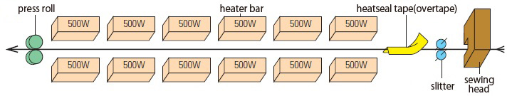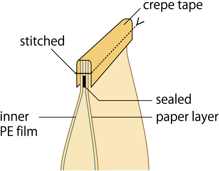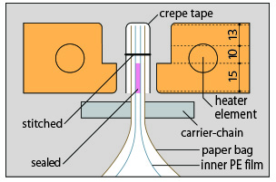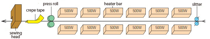 Model KS-2○○: The inner PE layer is sealed using two (or three) pairs of heaters, and then stitched with crepe tape.