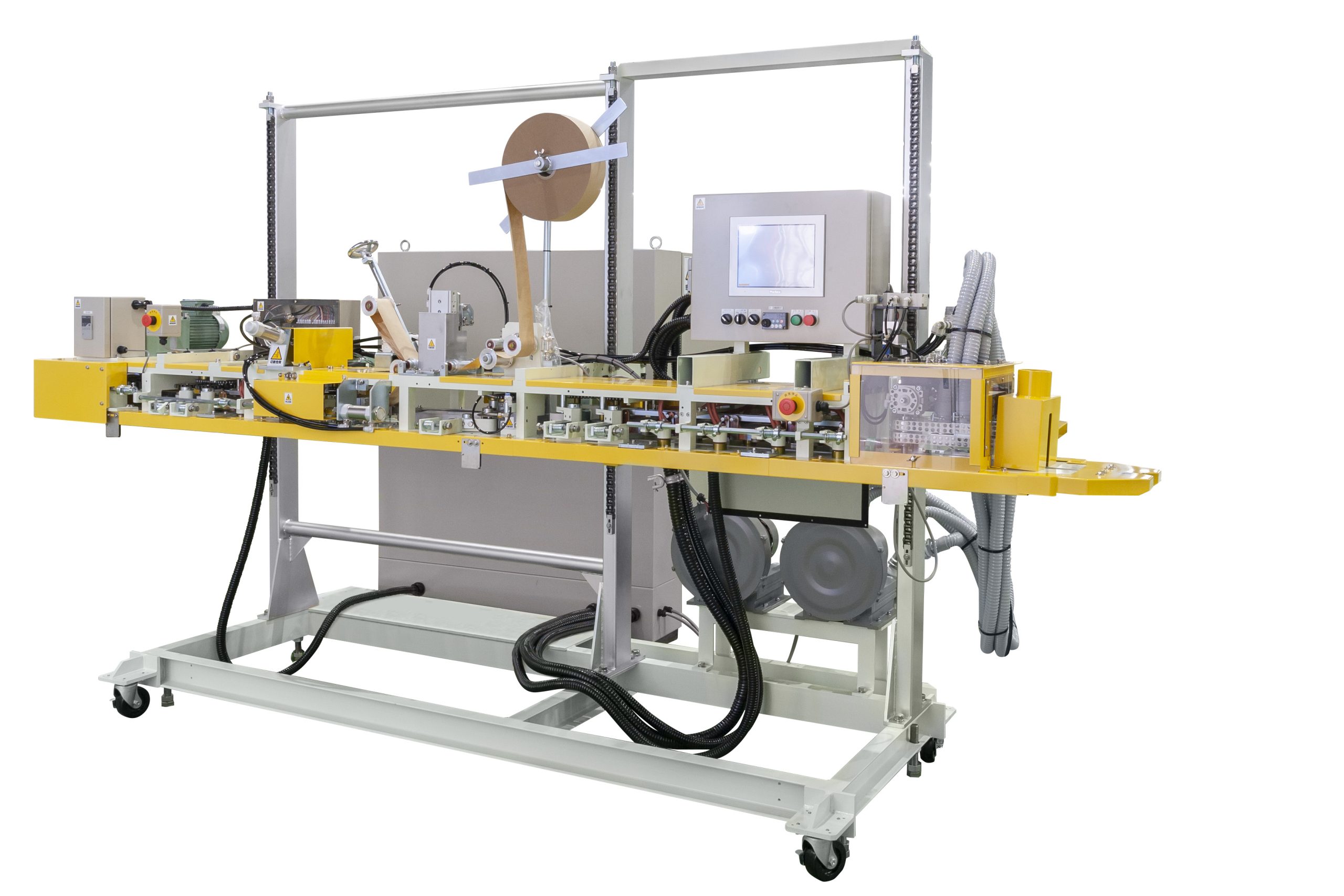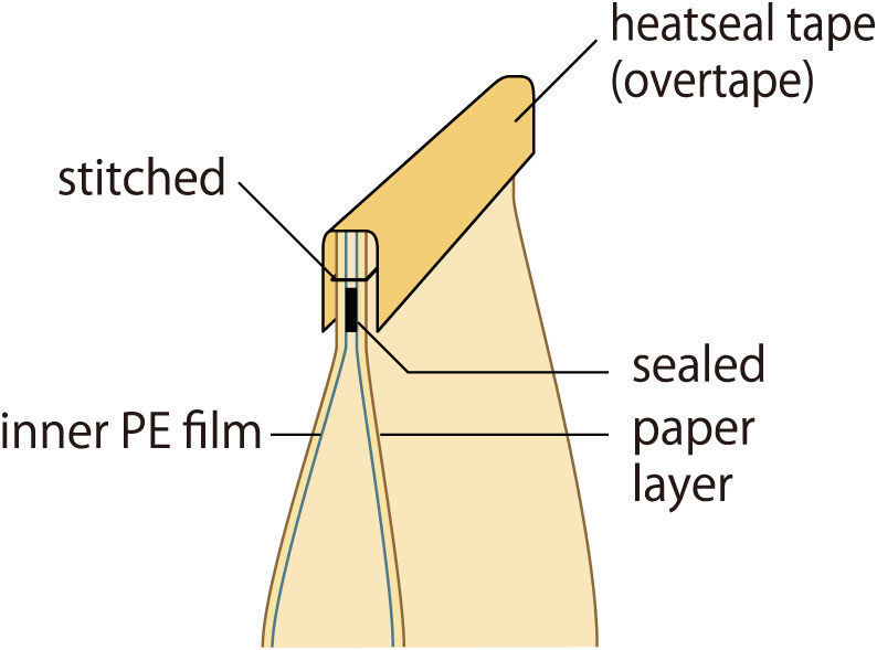 Trimming, stitching, heat-sealing (inner PE), and heat seal tape sealing can be done all at one-lined and automatic process.