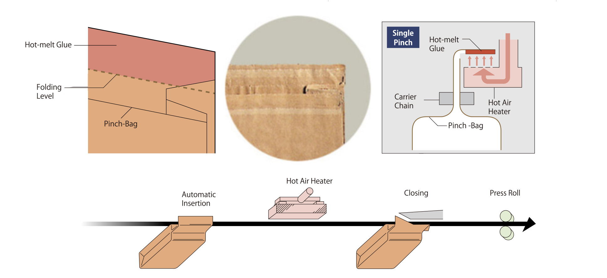 Bag top is folded in 90 degrees after product filling. Hot-melt glue is melted by heater air. The bag top is folded in 90 degrees again and pressed and sealed by press rolls.
