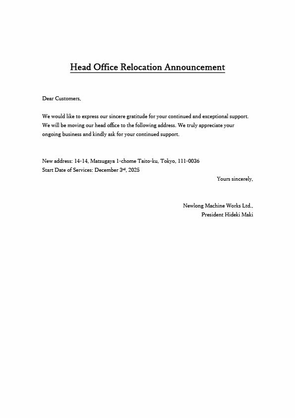 We would like to express our sincere gratitude for your continued and exceptional support. We will be moving our head office to the following address. We truly appreciate your ongoing business and kindly ask for your continued support.