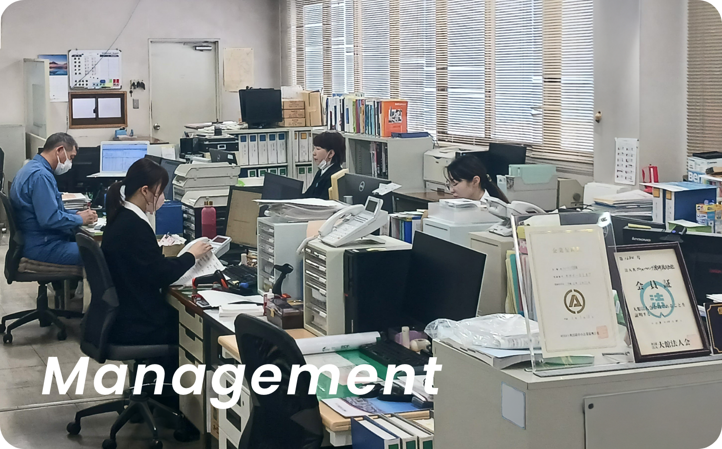 工場での受発注等の管理や、総務・経理、人事部門を担当します。