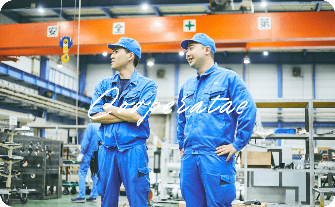 協力しあってます!工場内では設計から組み立てまでたくさんの仕事がありいろいろな職種の人が一緒に働いています。困ったらすぐ相談。協力しあって頑張ってます!
