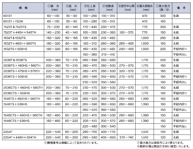 機種番号は袋幅によって定められていますが、このカタログでは代表的機種のみの表示となっています。高速汎用機として、機能も従来の機種に比べて、さらにグレードアップしました。型替え時間もさらに短縮し、袋サイズ範囲も広く対応でき、一段と高速化が計られています。最近のカスタマーニーズに対応できる機種をそろえています。