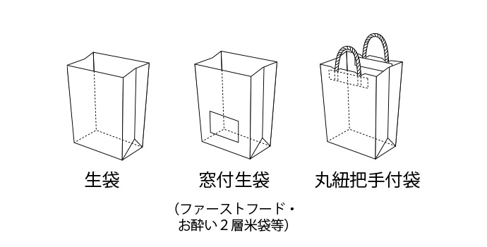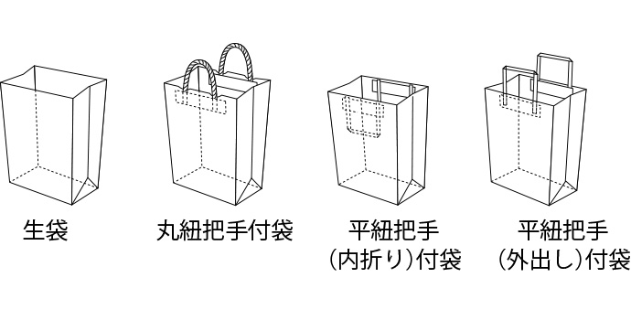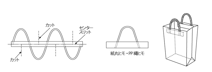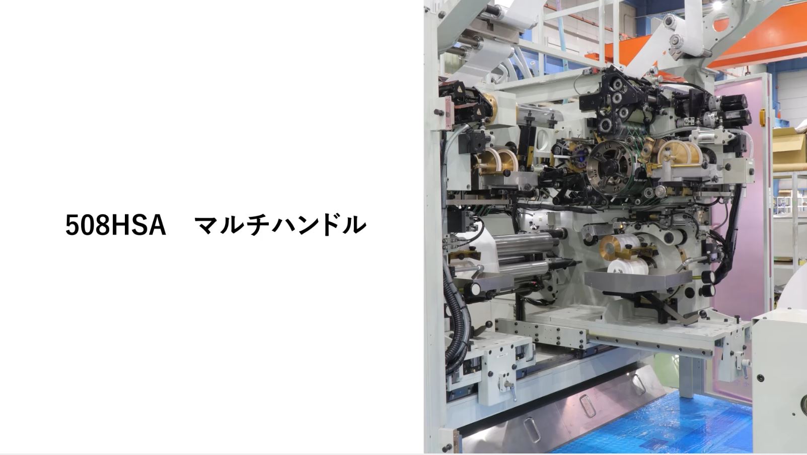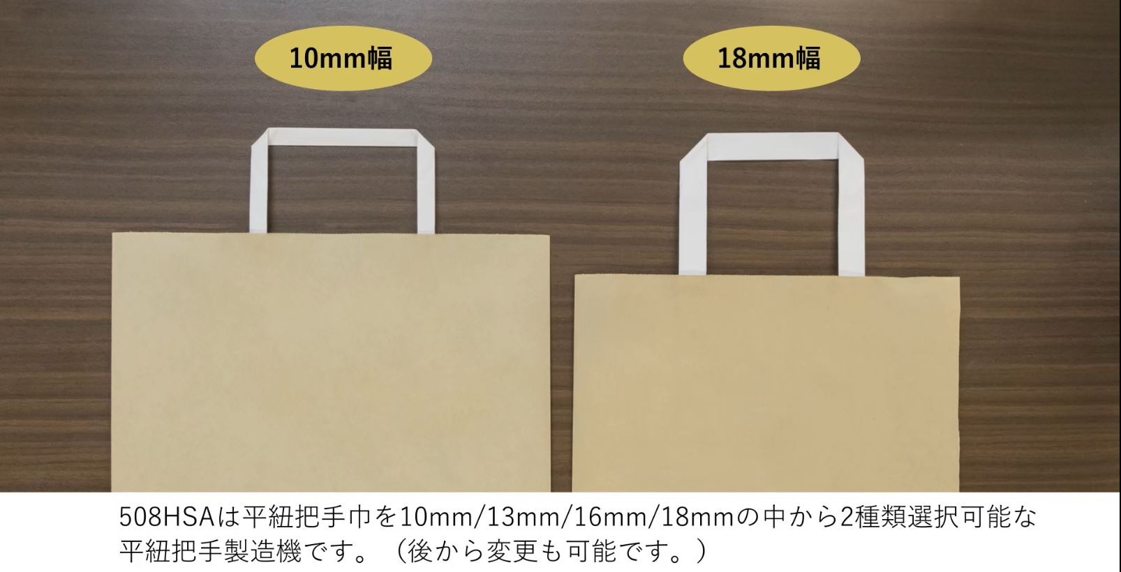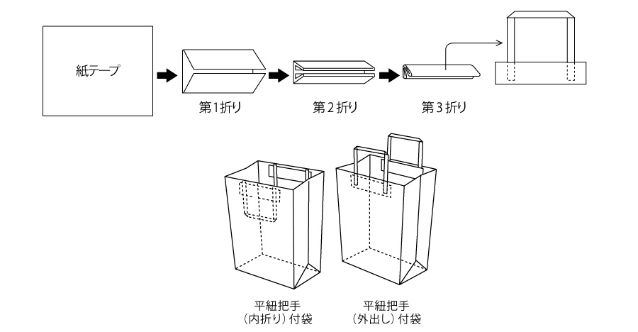 紙テープを一辺方向に順次折り込んで八つ折りにし、紙パッチと共に袋内側に貼り付けます。スタンダードでは、把手が内側に折り曲げられていますから取扱いが容易です。 オプションとしてサーボモーター搭載機種は機種番号の後にSを付けてHS型(508HS等)と表示されます。