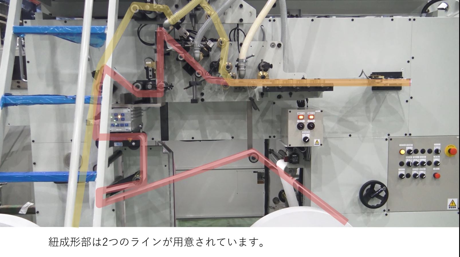 平紐成形ユニットは2種類(上段、下段に配置)の紐幅に対応しています。 紐幅は10mm、13mm、16mm、18mmより2種類のサイズを選択でき、 平紐U折シリンダー、U折ガイド(各紐サイズ1セット付属) 製袋機本体(1532TS、2036TS、1546CTS等の各機種)に接続が可能です。
