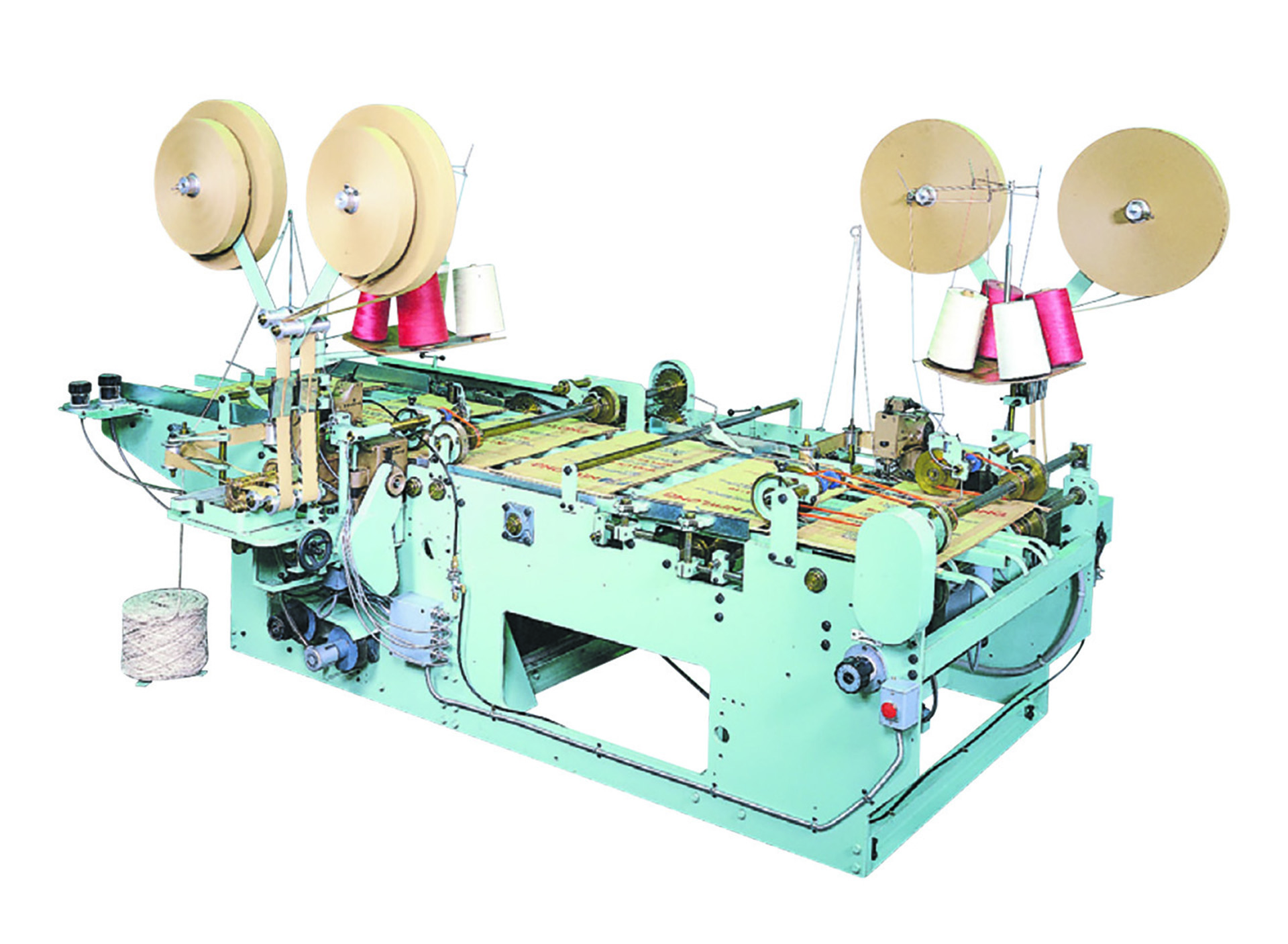 DN-2HSミシン、エアーカッター、引き出しロールと糊付け部分を含むテープアタッチメントで構成されたテーブルタイプの紙袋縫い用ミシンセットです。縫製できる袋の大きさは無限で、多種多様なサイズの袋を製造している小規模な工場に特に適しています。