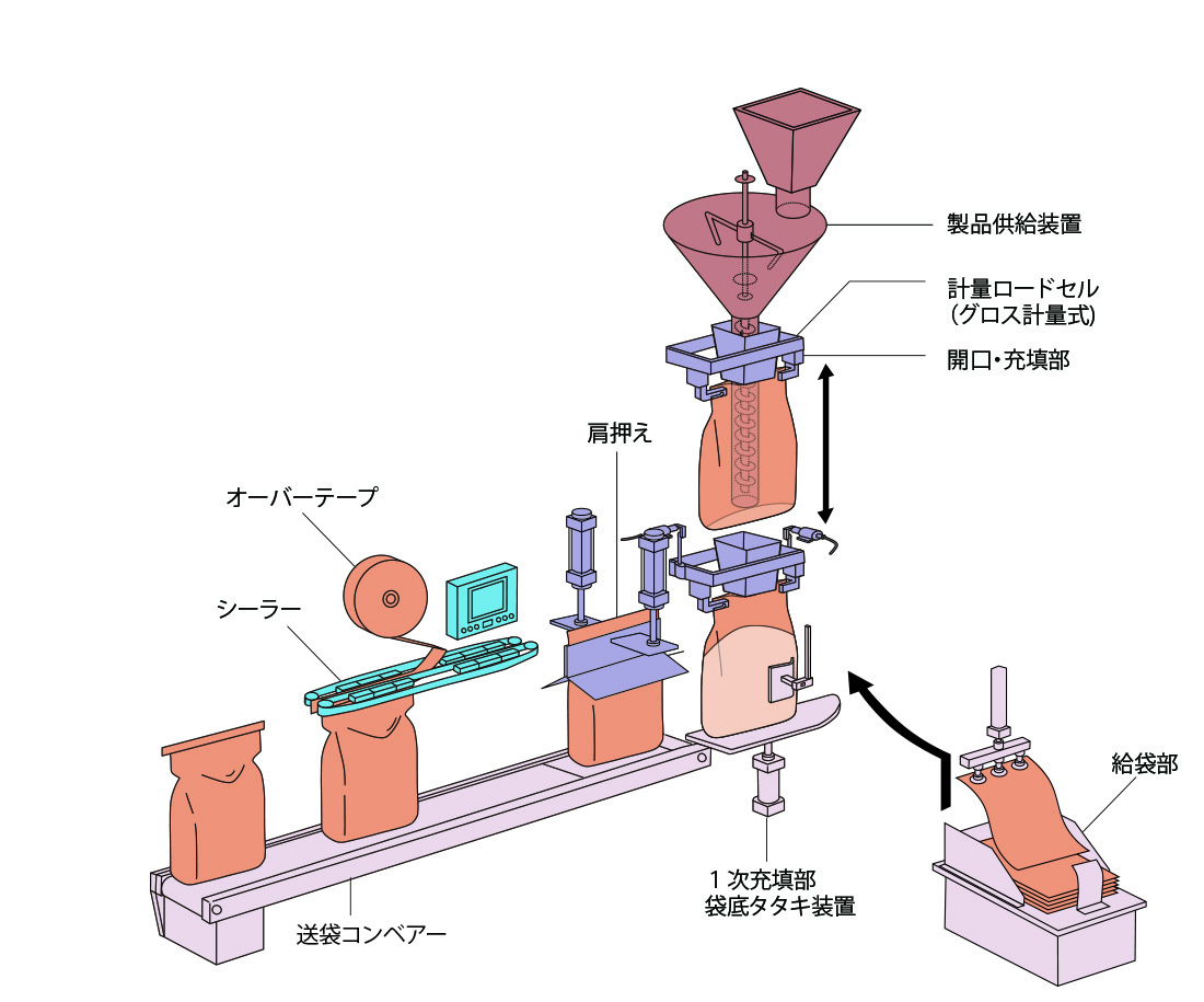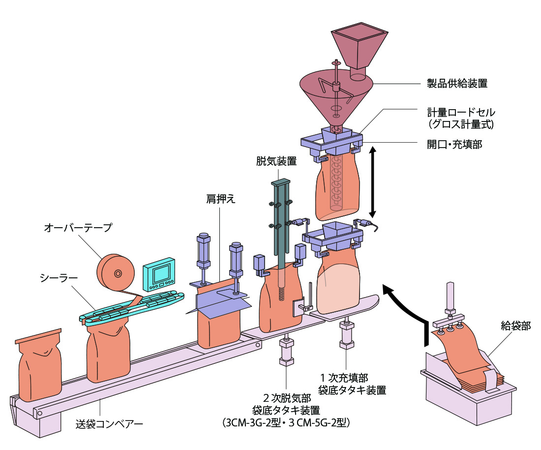 3CM-5FGは袋の底からオーガースクリューにて充填するグロス計量式自動給袋包装機です。