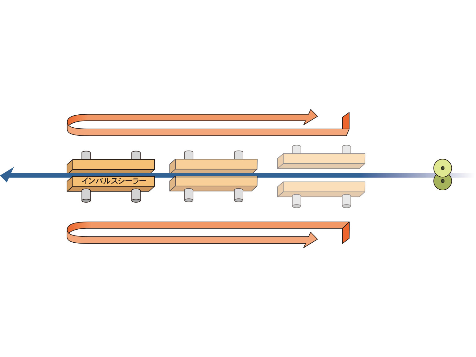 インパルスシール機がキャリアチェーンで運ばれた袋と同調して圧着しますので、平袋の他ガセット付きポリ袋にも対応が可能です。