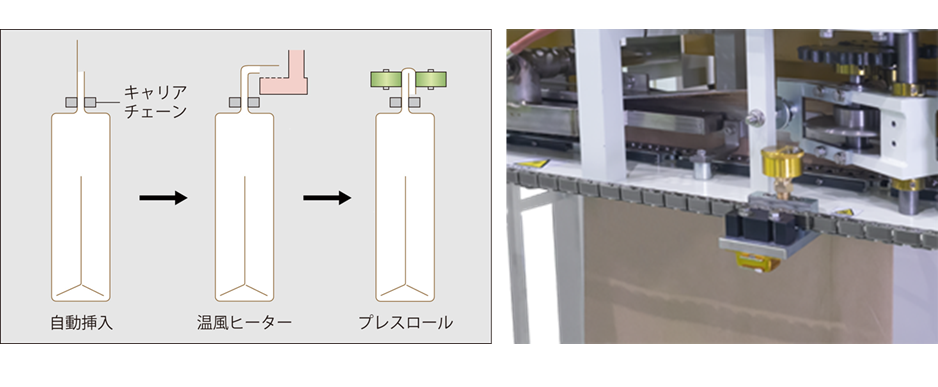 ピンチ袋のシール作業が、袋口先端をキャリアチェーンまたはベルトに挿入するだけで完成します。