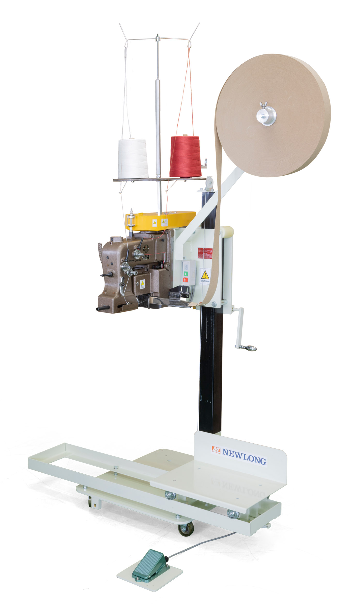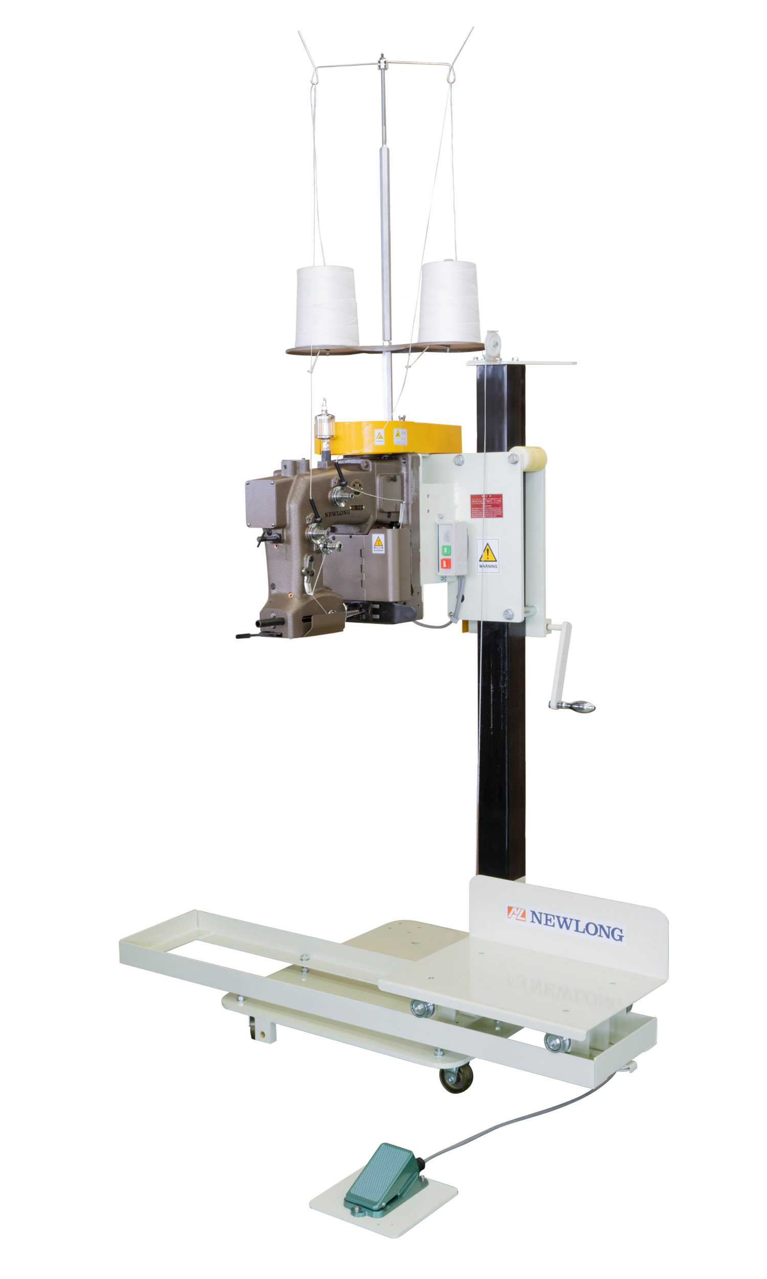 ミシン頭部はハンドル操作ひとつで上下調節が簡単に行えます。 台車は脱線防止装置、自動復帰装置付きのため、大変便利です。 電源さえあれば作業可能なため、袋詰めの省略化と合理化に大きく貢献できます。